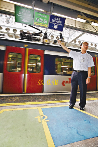 ■九鐵在上水火車站月台加裝電腦屏幕,提醒乘客列車前往的目的地,避免搭錯車,並在月台地面髹上藍、綠兩色,綠色為前往落馬洲、藍色為前往羅湖的候車區。本報記者高仲明 攝