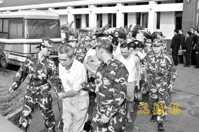 據了解,今日身著白底紅橫花紋T恤和白橫相間T恤的楊明德與林文強,早在1999年便被計劃遣返回大陸。但在當年2月,二人再度參與劫持執行遣送任務的飛機,被台北地方法院在2000年判處4年2個月的有期徒刑。
