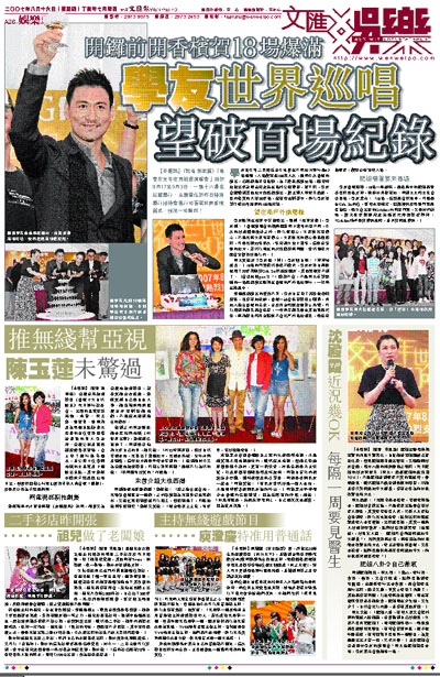 學友香港開騷,18場一早爆滿,連患病中的肥姐都嚷著要來捧場支持,對契仔疼惜有加。問到太太和女兒會否捧場,學友表示:「18場,始終都會來睇w,可能是坐Gife Set的位,暫時未有確定。紅館規例於每張門票都要抽稅,而大會出售的GifeBox內附有門票,又是如何計法,據天星多媒體紀念品獨家代理謝智楷解釋:「GifeBox純粹是買禮物送飛,並非買飛送禮物。」