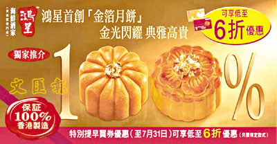 中秋佳節快將來臨,鴻星集團已敬備各款不同口味的月餅。首選推介全港首創「金箔月餅」,金光閃閃的金箔配以矜貴大方的包裝,多款口味以供選擇,送禮自奉兩皆宜。一向廣受歡迎的「雙黃白蓮蓉月餅」及「雙黃純蓮蓉月餅」更以震撼價5折發售;另外全新推出的金箔低糖全黃白蓮蓉(8個裝),適合健康人士。其餘各款月餅亦低至6折於美食博覽期間發售。