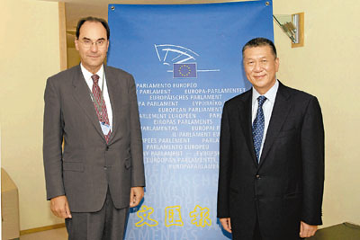 ■澳門行政長官何厚鏵於06年訪問歐盟,與歐洲議會副議長維達—瓜達拉斯(Alejo Vidal-Quadras)作禮節性會面。 資料圖片