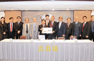 ■杭州市副市長何關新與會董呂明華互贈紀念品。