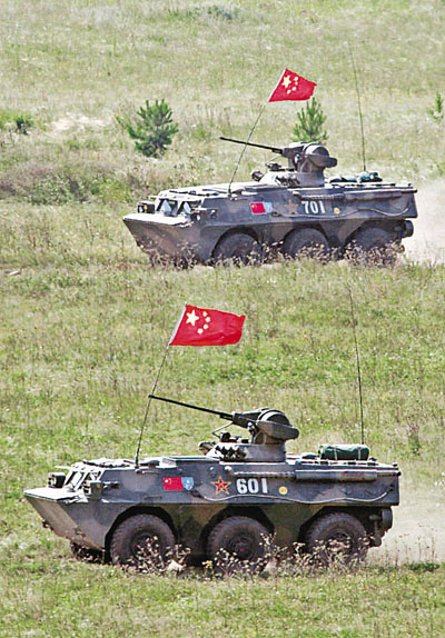 當地時間下午1時,3顆紅色信號彈升空,實兵演練開始。俄方一架「蜜蜂-1K」型無人機從西北方進入演習地域。參演部隊使用陸空偵察力量進行聯合偵察,並使用米-24直升機、蘇-25、直-9武裝直升機、殲轟-7、122自行榴彈炮、100突擊炮及電子干擾分隊等對被發現的恐怖武裝進行火力突擊。