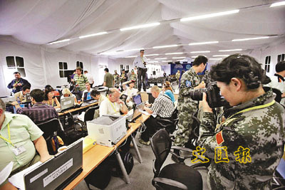 ■各國記者在聯合反恐媒體中心場景。路透社
