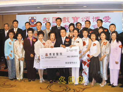 【本報訊】(記者 李慶全)博愛醫院「梨園戲寶頌博愛」記者會於昨日舉行,林余寶珠捐出一百萬支持該活動,博愛醫院董事局主席林建康代表接受支票移交,另出席支持的有紅伶陳劍聲及謝雪心等。林太經常行善,她是剛從加拿大返港即到來支持,談到先夫林百欣曾當老闆的亞視最近轉了新股東,林太表示由於剛返港並不清楚。主席林建康則表示未來也會籌辦多項慈善活動,也邀得陳奕迅、關心妍當「博愛慈善大使」,薛家燕及羅蘭則當上「博愛粵劇之星」,協助宣傳各項籌款活動。