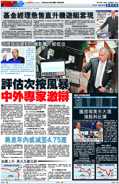 美國三大指數在聯儲局突然調減貼現利率半厘至5.75厘後大幅反彈,市場普遍憧憬港股周一將大幅反彈,及美國會在下月18日的議息中宣布減息。但針對美次按風暴將如何發展,各界意見則出現很大的分歧。兩位知名的分析家陶冬及高潮生昨在一個公開場合激辯;而中國前任財長、全國社會保障基金理事會理事長項懷誠也表示,對次按風波影響不能低估。