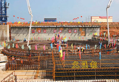 ■18日,中國東北第一座核電站──紅沿河核電站主體工程正式開工。遼寧紅沿河核電站計劃投資500億元人民幣,是國家「十一五」期間首個批准開工建設的核電項目。規劃建設6台百萬千瓦級核電機組,其中一期工程規劃建設4台核電機組。圖為建設中的遼寧紅沿河核電站一號機組核島。 新華社