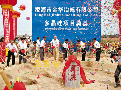 金華冶煉有限公司總投資11.5億元的多晶硅項目在遼寧省凌海市凌南工業園區舉行奠基儀式。國務院東北辦、省市有關領導,以及各界代表參加了項目奠基儀式。專家預計,在2008年底將實現年銷售收入超過15億元,稅後利潤逾7億元。