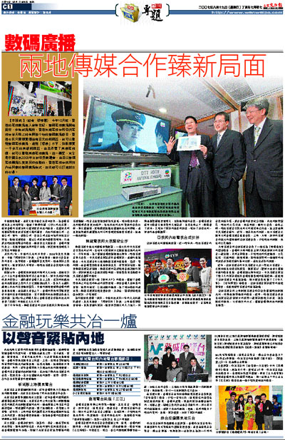 【本報訊】(記者 張晴雲) 今年10月底,香港的電視廣播進入嶄新世紀,數碼電視廣播開始面世,作為試播階段,香港無線電視台和亞洲電視台每天晚上將有兩個小時的數碼廣播節目,香港市民只要購買價值幾百元的解碼器,就可以看到數碼電視廣播,達到「標清」水平;如果購買一千多元的高級解碼器,並且添置了高清電視機,就可以看到高清電視廣播。這一轉變,完全是中國北京2008年主辦世界奧運會,並且以數碼電視轉播比賽實況所推動的,香港電視台採用與內地同樣的數碼廣播制式,彼此都可以打進對方的市場。