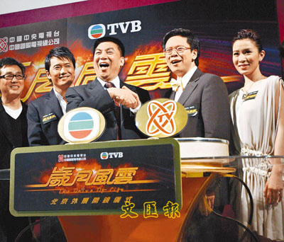 ■中央電視台與香港無線電視合作拍攝《歲月風雲》。圖為中國國際電視總公司總經理馬潤生與香港無線電視台廣播業務總經理陳志雲互換台標,並興奮地握手,宣告兩家電視媒體合作的開始。