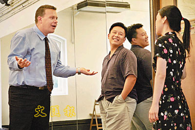 ■韋艾利(左)、陳麗珠(右)與導演施崇梵(中)在綵排中。