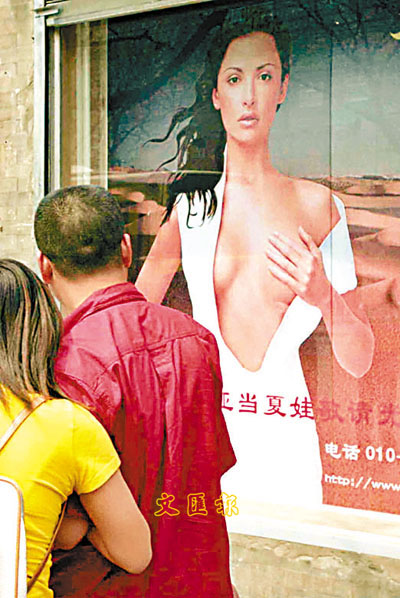 北京街頭一幅性感廣告,吸引路人側目觀看。