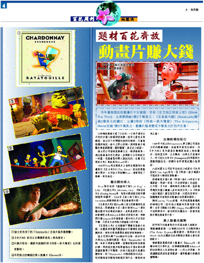 今年暑假推出的動畫片十分強勁,先有《史力加之咁就三世》(Shrek The Third),北美票房逾3億2千萬美元;《五星級大鼠》(Ratatouille)剛過2億美元的關口;上畫3周的《阿森一族大電影》(The Simpsons Movie)也逾1億5千萬美元,動畫片搖身變成千億美元計的大生意。