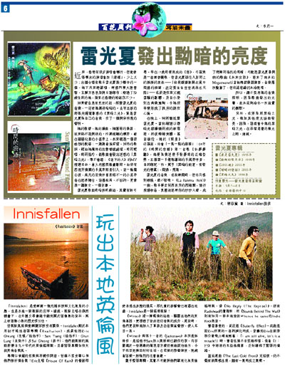 但樂隊風格與愛爾蘭宗教沒有關係。Innisfallen剛於本月初才推出首張專輯《Reallusion》,成員包括Eric Cheung(主唱/結他手)、Sam Tsang(結他手)、Chun Lung(貝斯手)及Sui Cheong(鼓手);他們說樂隊的風格啟蒙自九十年代的英倫搖滾樂,且看這張專輯如何大玩英倫音樂風。