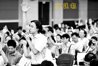 18日,在一場裝修建材團購會上,上海團購網站的砍價師(站立者)代表數百名消費者和商家代表「砍價」,爭取以低於市場價10%-30%的優惠價購得商品。新華社