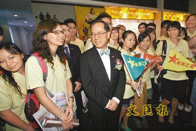 (本報記者 吳玫)「走一走 看一看──回歸十年憶小平」大型圖片展昨日在港開幕,約30位參加「未來之星──中國國情教育培訓班」的大專生亦被抽中,獲得出席開幕式的機會,他們得悉特首曾蔭權出席開幕禮,當他參觀完圖片展準備離場時,早已守候在門口的年青人馬上大呼:「港大、中大、科大……我們大學院校代表很想邀請特首跟我們合照啊!」曾蔭權聽後,馬上欣然接受,笑容滿面地走入人群中,並預祝他們北京之行「加油!順利!」本報記者潘政祁 攝