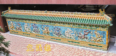 北京故宮皇極殿前的「九龍壁」建於乾隆三十八年,長20.4米,高3.5米,正面共由270塊琉璃磚拼接而成,是3座「九龍壁」中最精緻者,堪稱我國古代城市雕塑的典範。壁面飾有九條巨龍,各戲一顆寶珠,形體有正龍、升龍、降龍之分,每條龍都翻騰自如,神態各異;背景是山石、雲氣和海水。