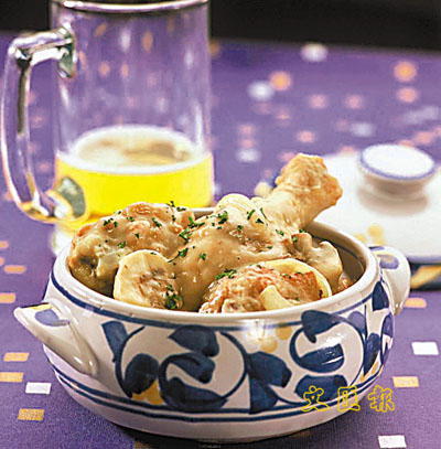 材料:雞髀800克(斬件)、鹽及胡椒粉適量、麵粉4湯匙、油3湯匙、牛油30克、洋蔥1個(切絲)、磨菇150克(切片)、啤酒1杯、清雞湯1杯半、鮮忌廉半杯、番茜碎2湯匙