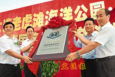 ■大連市市長夏德仁(左二),老虎灘海洋公園、老虎灘極地館總經理趙文敬(左一)接受國家5A級旅遊景區牌匾。 本報大連傳真