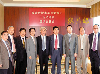 合肥市長吳存榮(右四)昨在下榻酒店會見泉州商會客人,指目前已有5萬多泉州人在合肥投資和居住,而泉州商會客人亦接受了吳存榮的邀請,將於近期赴合肥考察。 本報記者周然 攝
