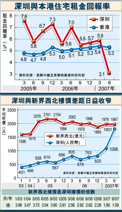 另外,內地物業租金升幅落後樓價,租金回報率低於本港物業,現時深圳物業的租金回報率僅3.1厘,而本港物業的租金回報率仍能保持逾5厘高水平,令本港物業仍受投資者追捧。