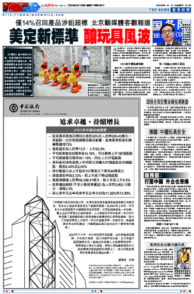 【本報訊】據中新網23日電:針對美國從6月份開始大規模召回中國造玩具,商務部副部長高虎城23日在國務院新聞辦公室舉行的新聞發佈會上表示,大部分被召回的中國玩具的原因,是由於美國方面於今年5月對玩具材料提出了新標準。所謂含鉛超標的問題,實際只佔玩具整體召回數量的14%,也就是說,大部分被召回的玩具都並無質量問題。
