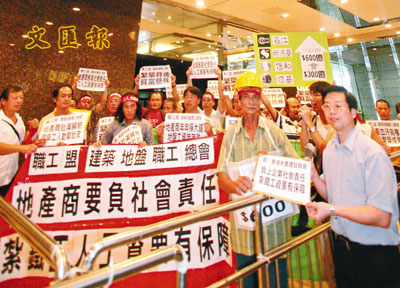 ■30名扎鐵工人昨午向地產建設商會代表遞交請願信,要求地產商協助他們爭取合理工資及工時。本報記者曾慶威 攝