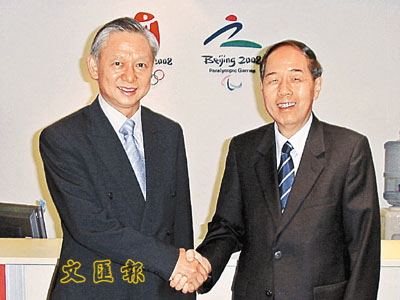 ■保安局局長李少光(左)昨在北京與08奧組委執行副主席李炳華見面。