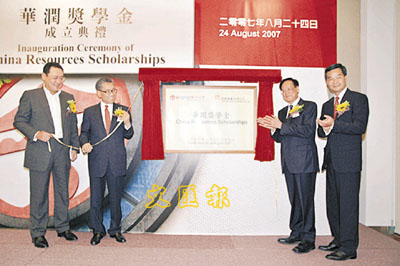 獎學金的成立典禮昨舉行。由華潤集團董事長陳新華、副董事長及總經理宋林、嶺大校董會主席梁振英及嶺大校長陳坤耀主禮。陳坤耀表示,「華潤獎學金」的設立除惠及內地偏遠地區的學生外,更可豐富嶺大的學生來源,加強嶺大國際化的發展,令海外及本地生同樣受惠。