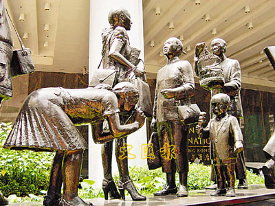 ■美國雕塑家Rob Mururaa的《香港人》,位於金鐘港麗酒店正門前,帶來另類「人氣」。