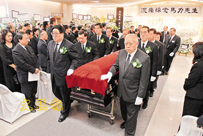 ■(右側)董建華、 唐英年、吳清輝、劉健儀;(左側)高祀仁、譚耀宗、梁振英、楊孫西扶靈送馬力最後一程。照片由民建聯提供