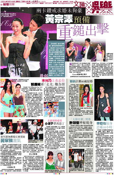黃宗澤笑指以前一直以為求婚送兩卡鑽戒就可以了,但昨日一戴上三卡的鑽石耳環就即時推翻這個想法,並揚言將來求婚一定會重鎚出擊。黃宗澤前女友甄穎珊日前宣布與蕭定一的合約結束後就會拆除胸部的鹽水袋,黃宗澤表示沒有聽過此事,並謂別人的決定,他不方便給意見。