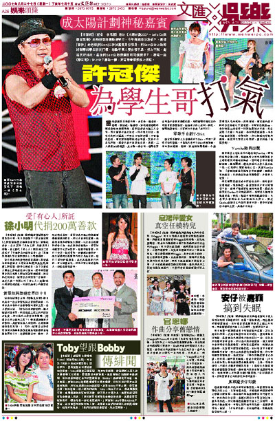 【本報訊】(記者 李思穎)港台《太陽計劃2007 -- Let's Go南區音樂會》前晚假香港運動場舉行,今年幾經港台游說下,邀得「歌神」許冠傑(阿Sam)以神秘嘉賓身份現身,阿Sam在台上為即將開學的學生朋友打氣,勉勵年青人要自強不息,努力不懈,創造美好將來。最後阿Sam在熱情觀眾和司儀要求下,清唱一曲《學生哥》,台上台下融為一體,把音樂會氣氛推上沸點。