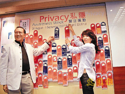 ■吳斌(左)聯同保障私隱特使鄭裕玲主持「私隱關注運動」的開幕儀式。本報實習記者陳美寶 攝