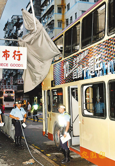 ■巴士撞向伸縮帆布簷篷後,遭簷篷的支架插入上層車廂,釀成7名乘客受傷。