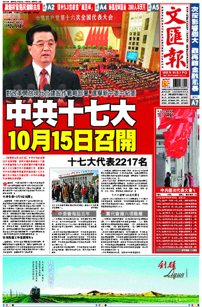 會議決定,中國共產黨第十六屆中央委員會第七次全體會議於2007年10月9日在北京召開。中共中央政治局將向黨的十六屆七中全會建議,中國共產黨第十七次全國代表大會於2007年10月15日在北京召開。