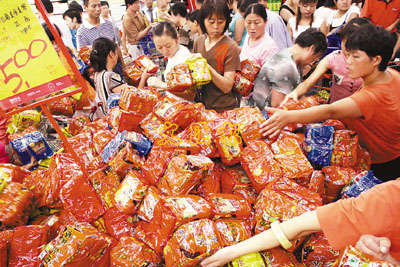 ■前段時間,方便麵行業串通漲價。圖為7月時在得知即將漲價的消息後,山東濰坊市民搶購低價方便麵。資料圖片