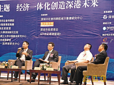 ■深港經濟一體化論壇,深港專家學者共話未來。左起:香港貿易發展局華南地區首席代表鍾永喜主席;中國香港商會廣東會長杜源申;新景程(深圳)國際物流有限公司董事陳怡;深圳卓越地產集團副總經理鄔風柏。