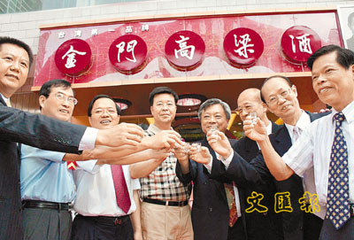 ■金門高粱酒是當地重要的經濟支柱,該公司已經進軍大陸市場。圖為金門縣長李炷烽(右五)為金酒福州專賣店剪綵。 資料圖片