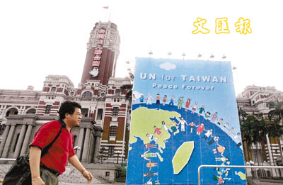■面對美國反對,民進黨當局仍繼續推動入聯,更在「總統府」前樹起廣告牌。 路透社