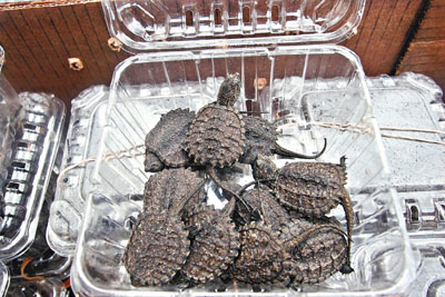 位於廣州芳村的花鳥魚藝世界到處可見到鱷魚龜的蹤影。鱷魚龜可分幾大種類,一隻平背鱷魚龜體重2斤多,算是中細尺碼,價值260元人民幣;龜殼上有刺的大鱷魚龜,可賣至600多元人民幣一隻,仍然大有巿場。店主表示,這些鱷魚龜多是來自美國,至於如何入口,則稱不太清楚,「是從批發商處取貨過來賣。」