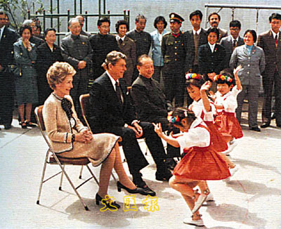 ■1984年汪道涵(右一)接待美國總統里根夫婦訪滬。