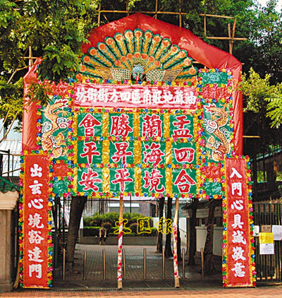 每年農曆七月「盂蘭盆節」期間,本港多個地方都可見到專門為此搭建的花牌和彩樓,以烘托隆重、莊嚴之氣氛。這些臨時性的牌樓,其形制源自中國傳統的牌樓建築。