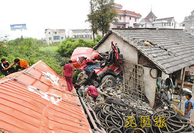 31日,一輛超長集裝箱車在行駛至滬杭高速余杭出口處時,因轉彎速度太快衝下路基,撞入一民房內,造成1人死亡、2人受傷。 新華社