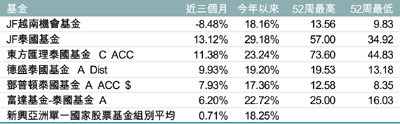 目前外資已持有越南股市總市值的25%,全球有52隻基金以越南為主要投資目標,韓國是主要的資金來源,今年以來韓國募集了八隻越南基金,額度超過10億美元,新加坡、馬來西亞、日本與以色列4月以來也募集了13隻越南基金,而在本港可公開發售是JF越南機會基金。