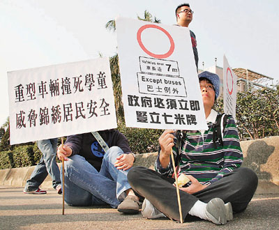 ■錦繡花園居民當日手持橫額,阻止重型貨車行經錦繡大道。資料圖片