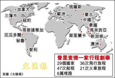 普里查德一家就這樣踏上一個不可思議的旅程。他們首站赴紐約,然後前往加拿大,遊歷完北美後便南下拉丁美洲,再跨過太平洋展開澳、亞兩洲之旅,最後乘西伯利亞快列返回歐洲,到訪意大利及瑞士等國。他們去年8月出發,足跡遍及29國,路程達6萬哩,坐過36次飛機、47次船及21次火車,這個366天的旅程花費超過5萬英鎊(約79萬港元)。