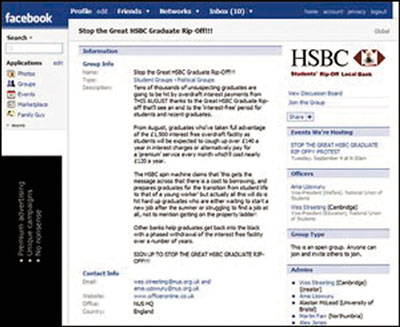 英國逾5,000名大學生透過每月平均逾3,000萬人瀏覽、影響力龐大的社交網站Facebook發起抗議行動,成功推翻匯豐銀行擬向透支畢業生收取利息的決定。