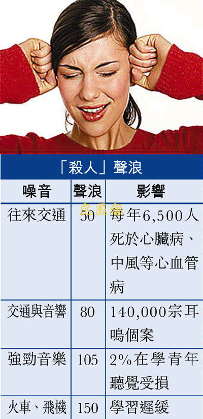 世衛組織分析結果顯示,英國死於心臟病、中風等心血管疾病的人中,約有3%是長期生活在交通噪音中,導致心理壓力過大和血壓升高,危及心臟。青少年也正面臨噪音威脅,調查顯示歐洲7歲至19歲的青少年中,約2%的人因聽MP3音樂播放器、參加音樂演唱會或狂歌熱舞,導致聽覺受損。