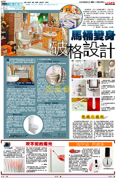 款式繁多而別具特色的「花式」馬桶,打破了洗手間的冰冷氣氛,愈來愈受客人的青睞。而且「花式」馬桶還獲取了6公升沖水的「專利權」,因為儲水量比一般馬桶的13公升儲水量要少,十分環保。